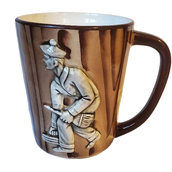 This mug features a traditional curler ready to throw the winning rock. The woodgrain design adds a rustic hometown feel. I can picture the crowd cheering at the local bonspeil. Could be part of a collection as I have seen a fishing mug just like this one.