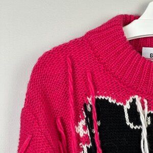 GCDS Red Distressed Hello Kitty Wool Alpaca Blend Sweater. Slightly pinkish red knit sweater. Slightly oversized fit. Black and white Hello Kitty on front. 0% Angel on back. Ribbed neck, hem, and cuffs. Drop shoulders. Wool fringe strings throughout. Materials: 50% Wool, 40% Acrylic, 10% Alpaca. No known flaws.