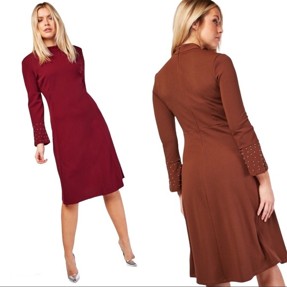 GDG Actuel Midi Dress With Encrusted Long Sleeves & Back Zip Maroon Red Small