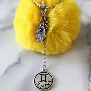 The faux yellow pom Pom has a split key ring attached with a Gemini charm and a Hamsa Hand.