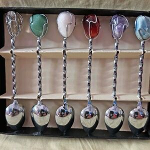 GEMSTONE SPOONS, SET OF 6, EACH SPOON 4 INCHES LONG, QUARTZ, AVENTURINE, PINK AGATE, CARAMEL AGATE, AMETHYST, BLUE AGATE, MADE IN BRAZIL, IN ORIGINAL BOX, NEVER USED, NO DAMAGE