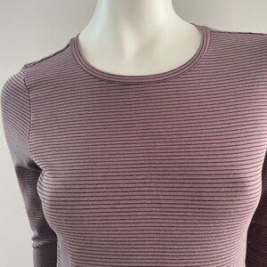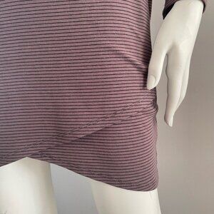 A great fall transition piece. This fitted stretch cotton striped dress is double layered in the front, featuring a layered accent and the knee length hemline. Great crew neck line and long sleeves make this a great casual and cozy dress.