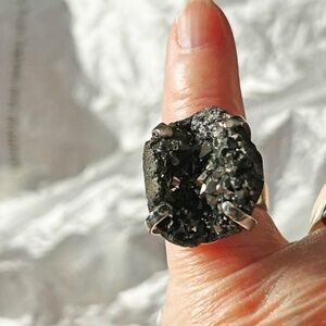 GEODE RING, GENUINE BLACK AGATE, REAL GEM CHUNK REALLY SPARKLES, WITH SILVER-TON
