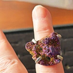 GEODE RING, GENUINE PURPLE/COPPERY AGATE, REAL GEM CHUNK REALLY SPARKLES, WITH SILVER-TONE SHANK, ADJUSTABLE, TAG ON, NEVER WORN