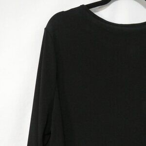This elegant black top features a classic round neckline with a subtle charm detail, adding a touch of sophistication to your wardrobe