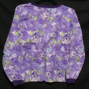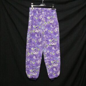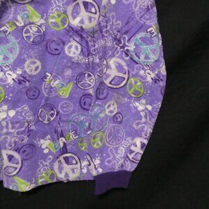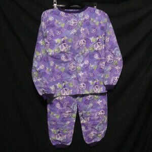 A cozy purple pajama flannel set featuring a playful print with peace signs and floral accent