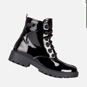 Casey model: comfortable breathable ankle boot taking its cues from military-style combat footwear. Crafted from a patent-leather-effect material in an all-black palette, this version of the Casey ankle boot exudes unmistakable urban attitude and taps into the sharp elegance of military combat footwear. It is the perfect way to round off a metropolitan vibe with plenty of rock-chic allure.