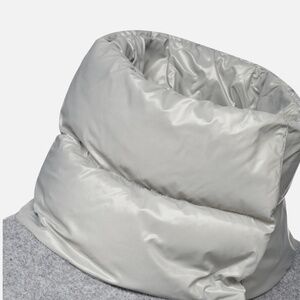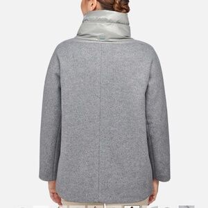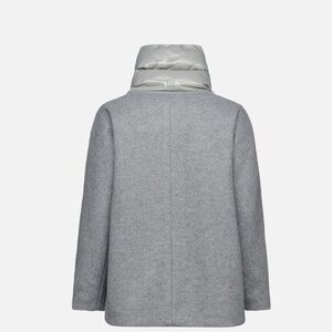 Short wind-blocking coat for women with a concealed closure and a modern urban aesthetic. This versatile version has been made from a wool-effect material in a muted-gray shade with a marled effect and completed with glossy-nylon details on the large cocooning collar. The ideal choice for city dressing, Diamanta has a quilted lining filled with recycled EcologicWARM wadding.