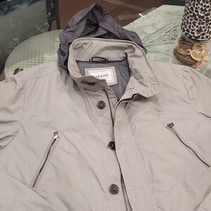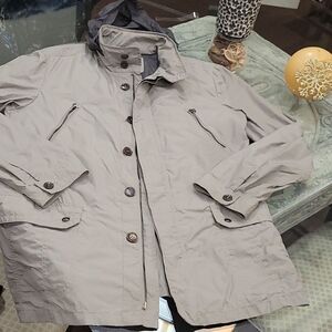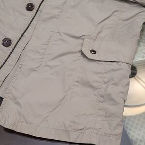 Gorgeous color jacket of a famous brand so nice , new no tags many pockets, zip and buttons, hood, I love neutral color and weightless feel, breathable patent material, Italian design, size L.
