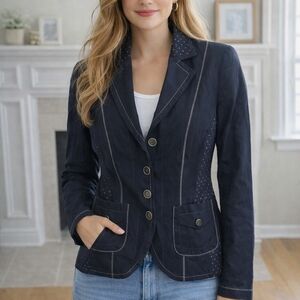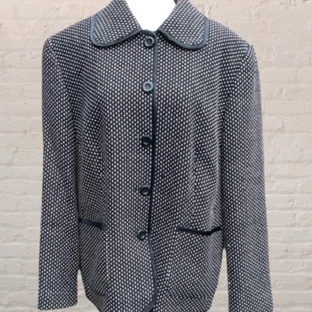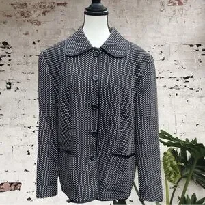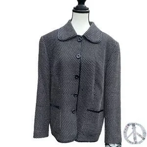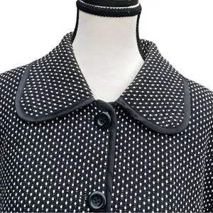 GERRY WEBER- * vintage * BLACK & WHITE WOVEN PETER PAN COLLAR LINED JACKET/BLAZER WITH BLACK SATIN PIPING & POCKETS. BEAUTIFUL CHECKER SQUARE DOT PATTERN WHITE ON BLACK. LIGHTWEIGHT AND IN EXCELLENT CONDITION. VERY VERSATILE, QUALITY PIECE FOR A CLASSIC CAPSULE WARDROBE.SIZE 14