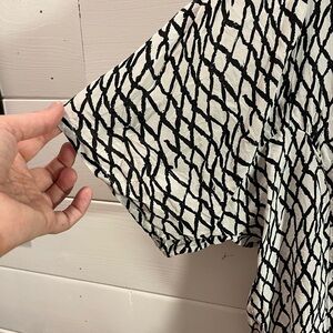 Haut moderne à imprimé abstrait noir sur fond ivoire, signé Gestuz. Tissu léger légèrement texturé, manches mi-longues et coupe droite. Une pièce originale mais facile à porter, parfaite avec un jean ou un pantalon habillé.