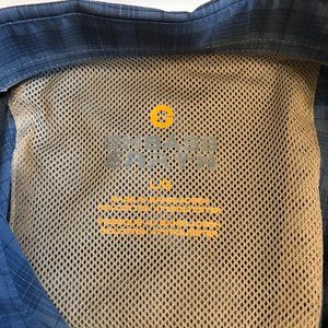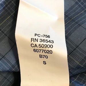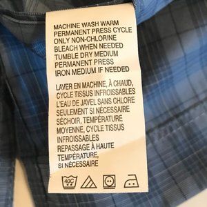 A GH Bass Earth branded blue plaid short sleeve men's shirt. It has two front pockets that have velcro closures. At the bottom of the shirt there are finished side splits so shirt can be worn tucked in or as an overshirt. There are two extra buttons sewn on the inside of the shirt if needed. Shirt is made in Bangladesh. Shirt is 53% Cotton and 47% Polyester - Nice light material for summer and in great condition.