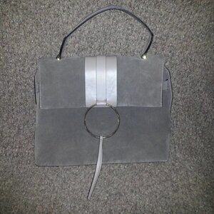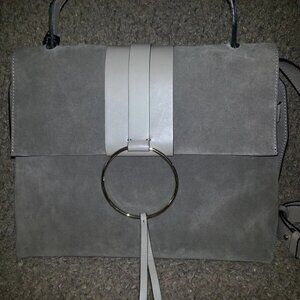 THIS SUEDE HANDBAG IS FINISHED WITH SMOOTH LEATHER INSERTS.