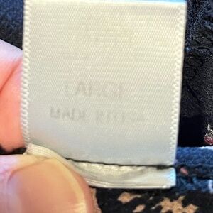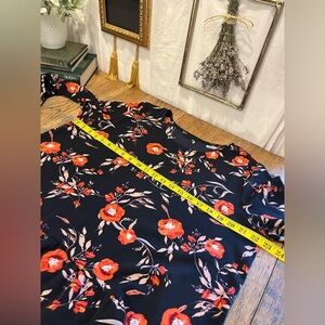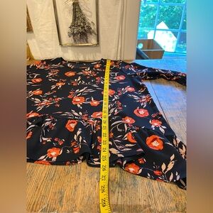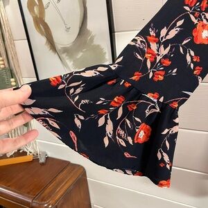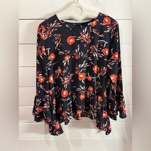 Elegant floral blouse from Gibson, size Large. Navy blue base with vibrant red and pink floral print. Features long sleeves with ruffled cuffs, flowy silhouette, and a feminine peplum-style hem. Perfect to pair with jeans or a skirt for day-to-night style.