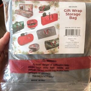 Gift wrap storage bag with handles and zipper lid. This bag is fantastic to hold all your wrapping paper for the holidays. It is extra long so can accommodate all sizes of wrapping paper rolls. I love mine! Keeps all the wrapping material organized and easily accessible.