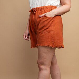 terracotta shorts, frayed hem shorts, plus size summer shorts, elastic waist shorts, casual drawstring shorts, boho boutique shorts, high waist shorts, rust shorts, relaxed fit shorts, lightweight woven shorts