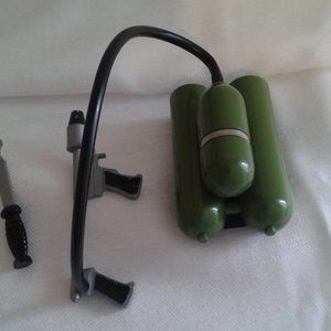 Duke comes with hat, helmet, shirt, belt that holds and has 6 grenades, pants, boots, mobile phone backpack, tank backpack for flame thrower, flame thrower, knife that fits in his pants pocket, his dog tag, and his Marine Manual booklet