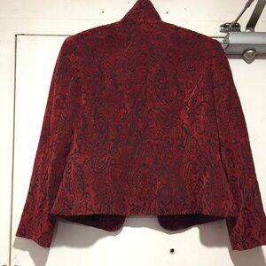 Gilani Women's Formal Blazer, Lightweight Size 8, Color Red, Black Pattern, 75% Cotton, 25% Polyester, Lined, Front Pockets, Shoulder Pad, Closure Buttons, Good Condition, Relaxed Fit, Great Look, Great Fit.