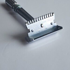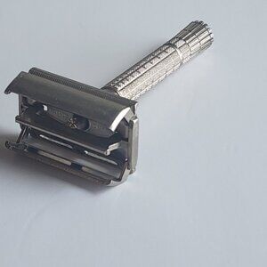 Another Gillette safety razor, but it is silver-toned. The head is the "TTO" or "Twist-to-Open" style, also known as a "butterfly" opening, which was very popular on Gillette razors. The handle has a similar textured pattern to the gold one, but a slightly different knurling design. Single blade MADE IN USA