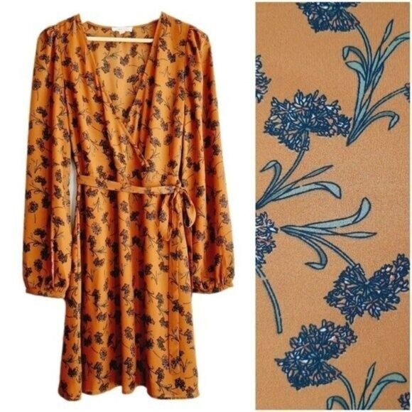 • Long sleeve surplice v-neck dress in orange undertone brown/tan with side zip closure and tie belt. Light semi-sheer fabric.