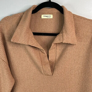 GINGER G Taupe Brown Collared Sweater Split V-Neck Horizontal Rib M