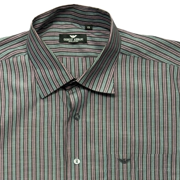 GIORGIO ARMANI Menโs Short Sleeve Button down Striped Shirt, Purple/ Blue, Large