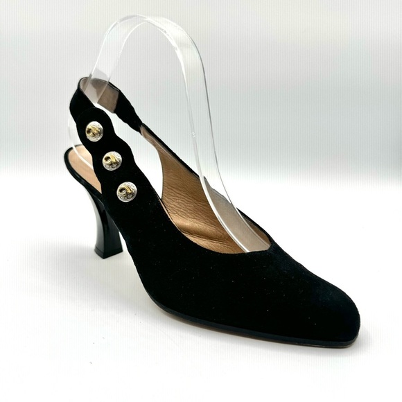 (meta: Explore Giorgio Fabiani black suede slingback heels in size 38.5, a rare vintage find. Made in Italy, these pointed toe heels are in amazing condition, perfect for collectors.)