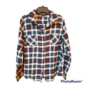 Cotton with metallic threads, 2 pockets, long sleeves with buttons. 25" shoulder to hem and 21" armpit to armpit approximately. Girls size 16