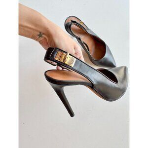 GIVENCHY Black Leather Gold Shark Lock Slingback Pointed Toe Pumps, Size 36