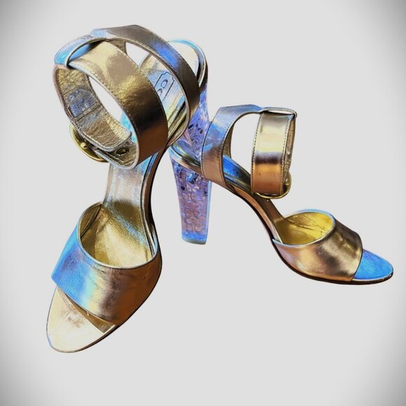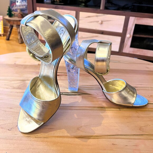 GLAMOUROUS COACH GOLD Ankle Strap Lucite Heel Shoe Brandey Sz 7.5 EUC
