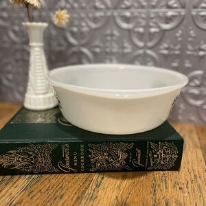 Charming vintage Glasbake oven dish, model 514, featuring a beautiful blueberry motif in blue and green. Made of white opaline glass, this collectible piece brings retro flair and everyday function to your kitchen.