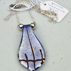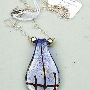 GLASS METALLIC FOIL SPOON PENDANT NECKLACE, 22 INCHES, HAND BLOWN GLASS WITH SILVER TONE BEADS, SILVER TONE CHAIN, BLUE/SILVER/BROWN, SPARKLY FINISH, TAG ON, NEW