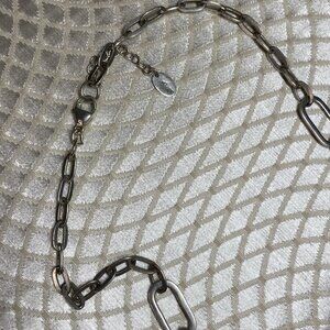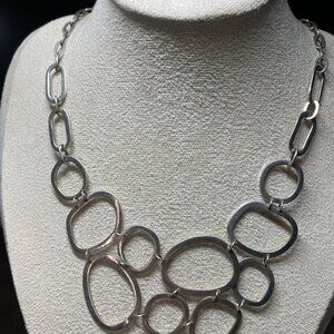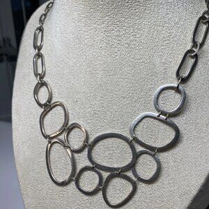 Articulated necklace composed of open oval and elongated oval links of graduated sizes. Matte/satin finish. Lobster clasp with branded tag.