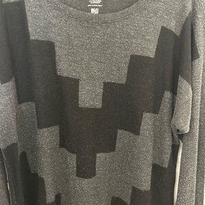 Chic gray top from GO Couture's Vintage Edition from Nordstrom. Black design on front of this light, knit sweater. Perfect for spring, not too warm. Looks cute with black pants or leggings. Soft fabric looks pilled up close (see pics), but is just the fabric of the sweater. Whole sweater has been gone over with fabric razor to remove any actual pilling. Fit is oversized: 22” pit to pit, 27” from shoulder to hem on front, but longer on back by additional 5” at longest point. Soft, cozy, easy to throw on. 47% rayon, 47% polyester, 8% spandex. Made in USA.