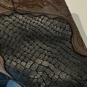 Genuine leather ankle high heel boot with snake print and flowers details.
