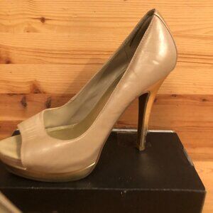 GOLD HEEL Cream Tan Champagne Leather Platform Stiletto Sz 8.5 Peeptoe 5+inches
