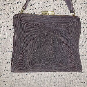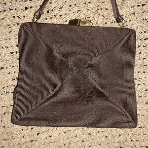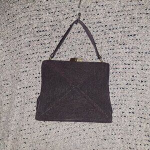 The product is a vintage 1950s corded chocolate brown purse with a unique satchel style, complete with an attached coin purse for added flair.