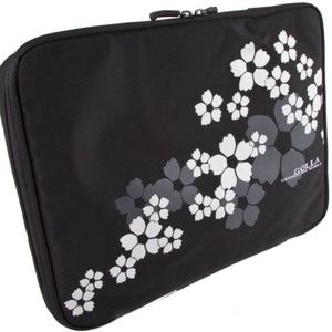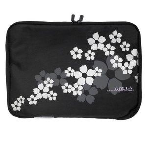 GOLLA Laptop sleeve travel case with hidden handle and pocket on the back for documents. Two zippers. Compact and padded. Good protection. Very clean. Excellent condition, like new. Color: Black with white, silver and grey floral print. *Some discolouration on zippers, nothing major - not really noticeable (see picture).
