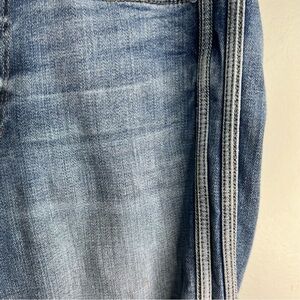 Gap-proof contoured waistband perfects the fit of straight-leg jeans cut from faded, curve-sculpting stretch denim highlighted with athletic stripes.
