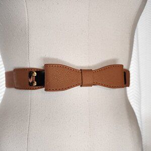 This beautiful tan faux leather bow tie with gold metal plate belt, add instant chic to any outfit.