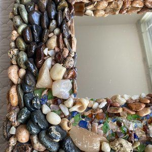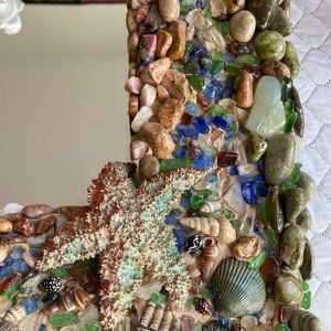Beautiful hand made mirror artwork adorned with rocks, seashells, sea glass and a beautiful little starfish. Mirror has some minor surface blemishes but nothing that detracts from the absolute beauty of this piece.