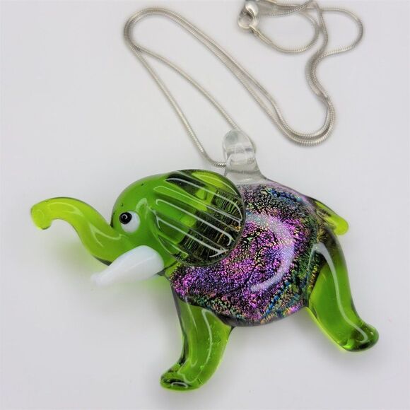 Green Glass Acrylic Elephant Pendant Necklace with shiny Purple gold specks