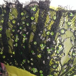 Simply Timeless, this lace and touched dress has beads, sequins and an under crinoline. It has a dropped waist, with a bow. The bust is accented by black lace which is covered in sequins and beads. There are some loose beads at the back by the zipper but fixable. This is a size 12 by Night Moves.