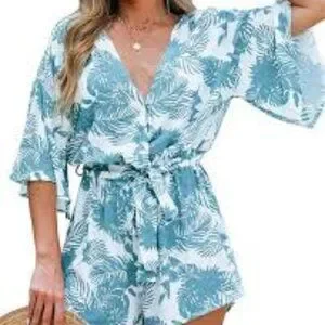 New CUPSHE Women's Tropical Floral Leaf Print Belted Romper Mini Jumpsuit with Flare Sleeves