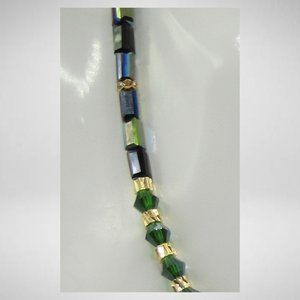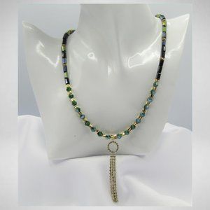 A NEW and HANDMADE fashionable green beaded jewelry set with a rhinestone tassel. Includes necklace, bracelet and earrings. Each piece is hand-made and designed by me.