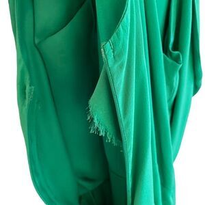 Adorable sleeveless silk wrap dress in bright apple green features a ribbon tied racer back, tulip hemline, and front slit pockets. V-neckline with snap button closure. Hidden side zipper closure. Fully lined. Outer fabric is 100% silk, lining is 100% polyester. L