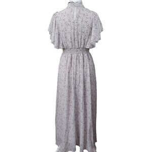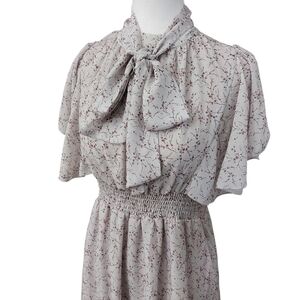 - A light and airy floral dress with voluminous ruffle sleeves, elastic waist, and a bow tie that can be tied front or back.