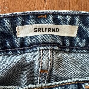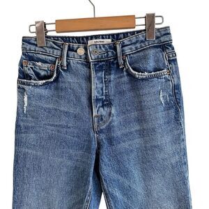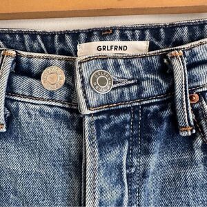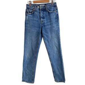 In excellent condition. GRLFRND's answer to a distressed straight-leg jean with a very 90s vibe. Intentional fading and whiskering, and cropped at the ankle. Traditional 5-pocket styling and a button fly. These jeans have an extra button a the waist that was added.
