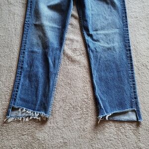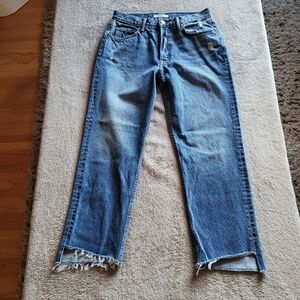 High rise, straight leg jeans with an asymmetrical cut raw hem. In very good used condition. Color is Close To You
