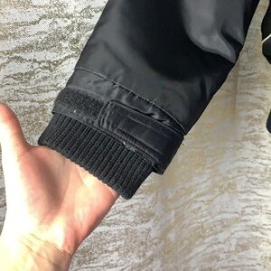 - Gorgeous black detailed with white trim winter jacket with removable faux fur hood.inside with fleece.very warm and comfy to wear.two side slip pockets with full size zipper closure